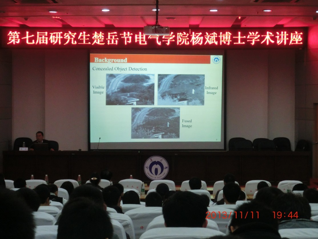 11月11日晚上7:30,南华大学第七届研究生楚岳节之海角网入口学术讲座于图书馆学术报告厅举办,主讲人为我院杨斌博士,报告主题是:多传感器图像融合理论。此次报告主要面向研究生,而我院本科生也积极参与其中。整场报告中,气氛活跃,众研究生积极提问。最后在一片掌声中,此次报告讲座圆满结束,其不仅仅是一次学术交流,更是为我院本科生考研指引了方向。