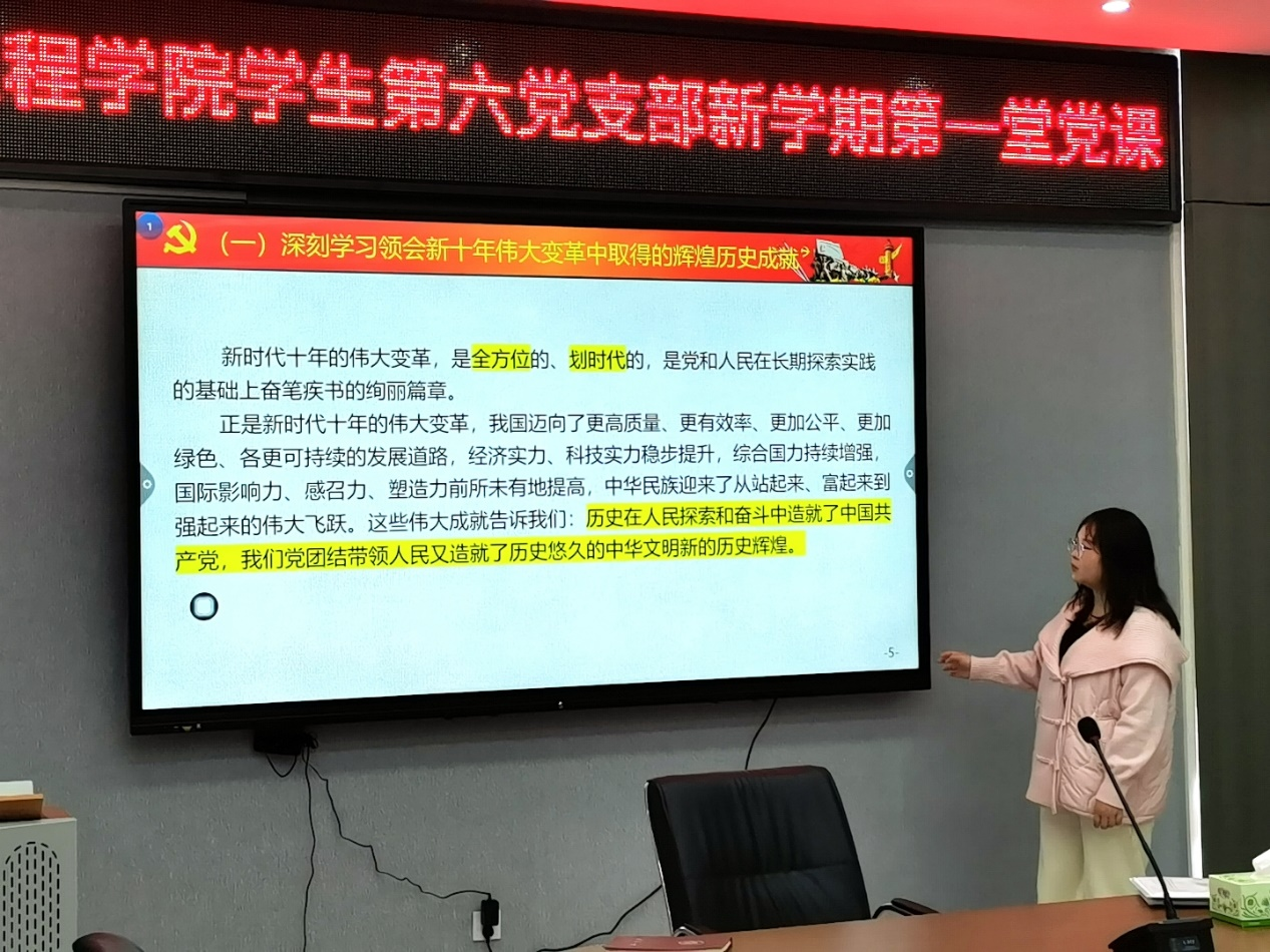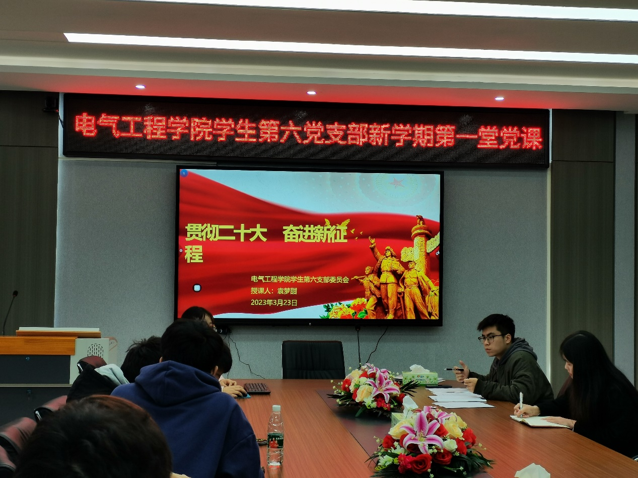 为全面深入学习贯彻党的二十大精神,引领全体学生党员坚定理想信念,凝聚奋进力量,2023年3月23日中午,海角网入口学生第六党支部“新学期第一堂党课”于电气楼B301开展。党课由学生第六党支部书记袁梦甜老师主讲,学生第六党支部全体党员、入党积极分子参加了此次党课。