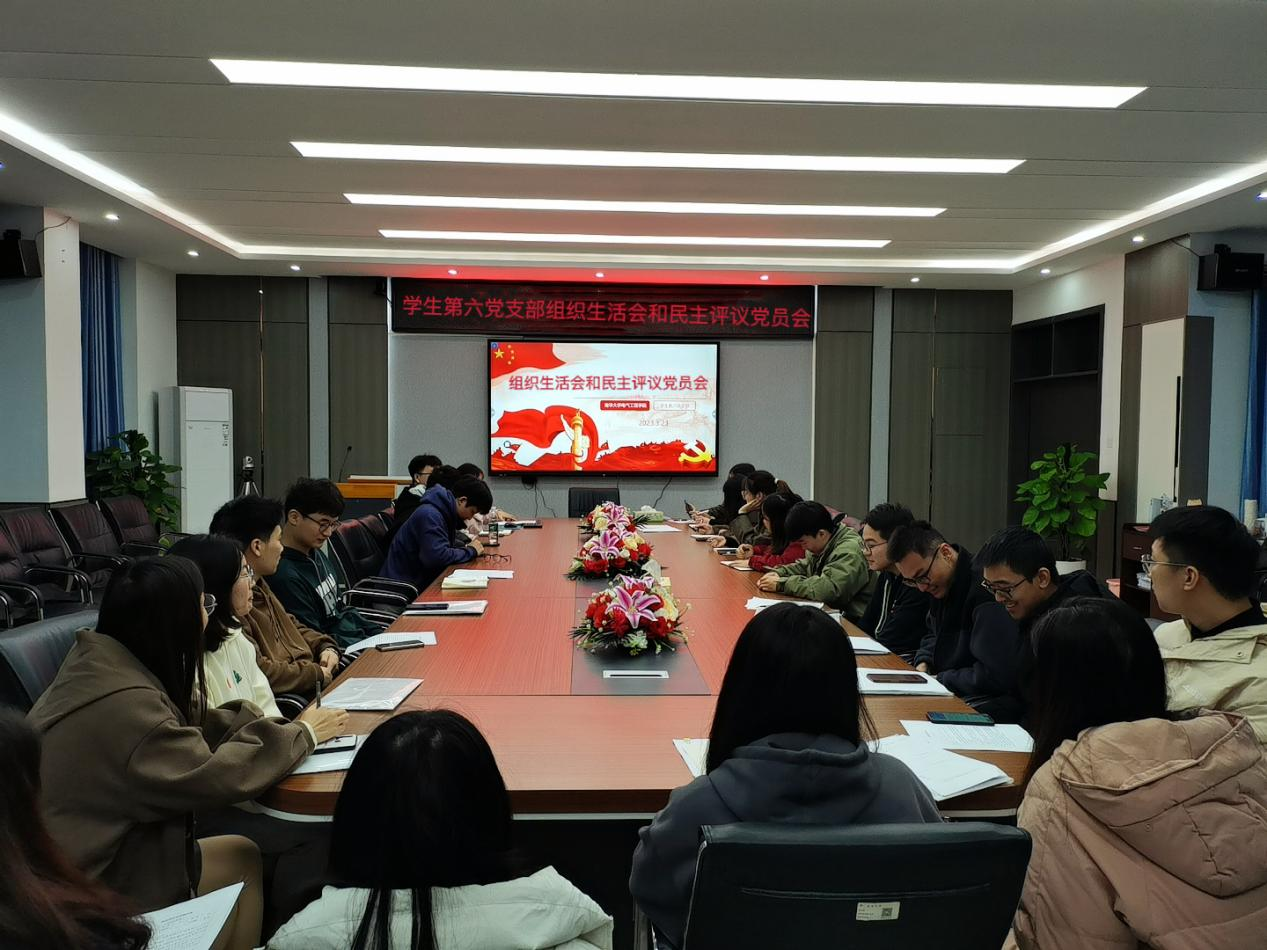 2023年3月23日中午,海角网入口学生第六党支部“组织生活会”和 “民主评议党员会”于电气楼B301召开。学生第六党支部书记袁梦甜与学生第六党支部全体党员参加会议。