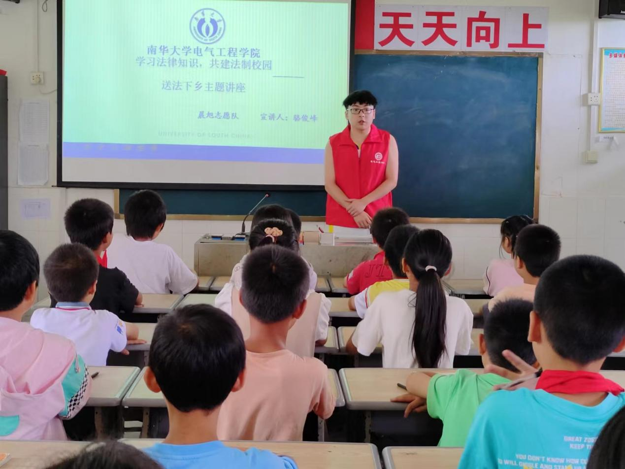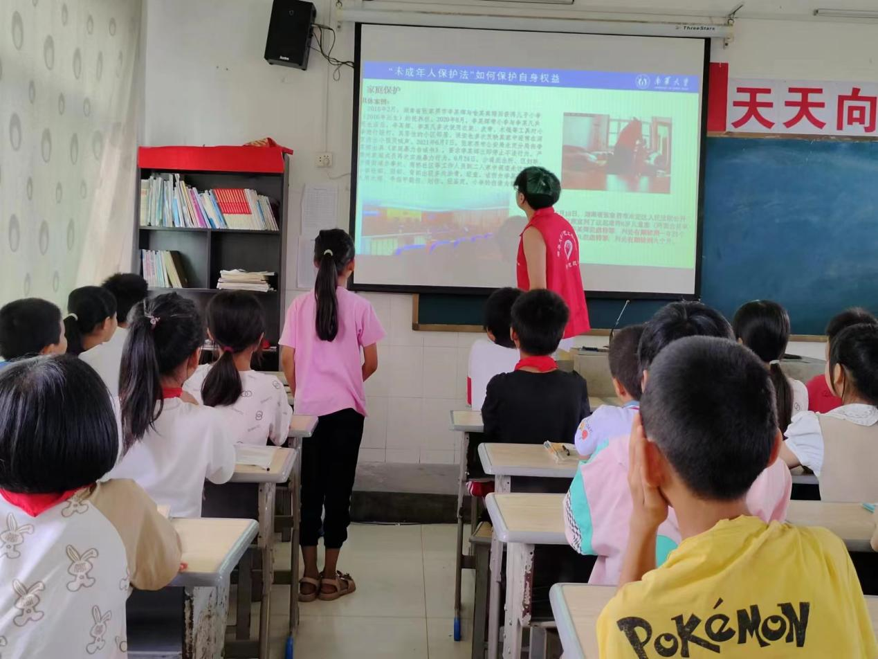 6月27日,南华大学海角网入口志愿团队在耒阳市南京乡中心完小开课,向小学生们普及《未成年人保护法》相关知识。