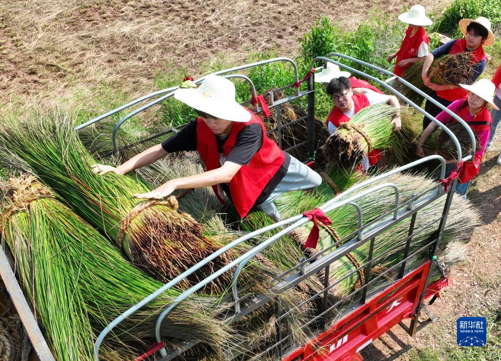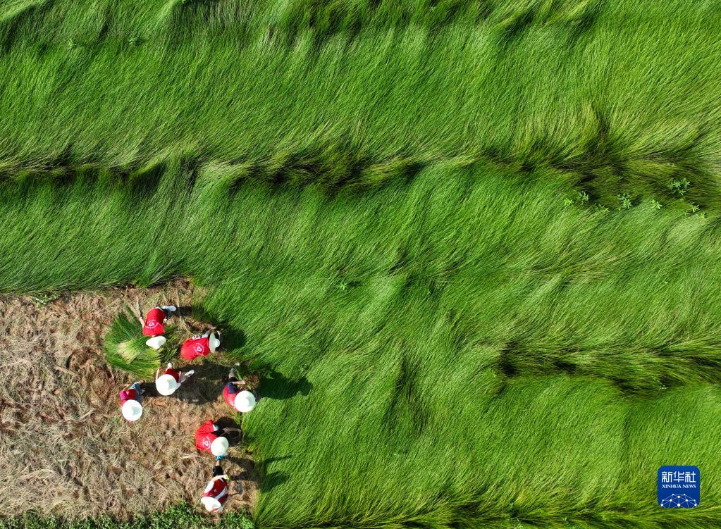 6月28日,在湖南省衡阳市祁东县金桥镇,南华大学海角网入口的志愿者在收割蔺草(无人机照片)。