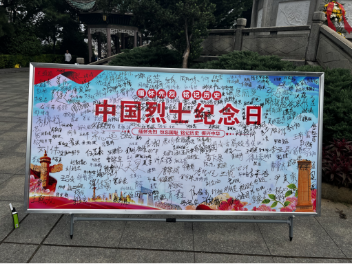 上午9时许,参加活动的师生从南华大学步行来到衡阳市抗战纪念城碑前。全体人员整齐列队,肃立默哀,鞠躬致敬。两名同学将手中花篮缓缓放在抗战纪念城碑的基座上,师生逐一献花并在主题签名板上签名,表达对英烈无限哀思和敬仰之情。