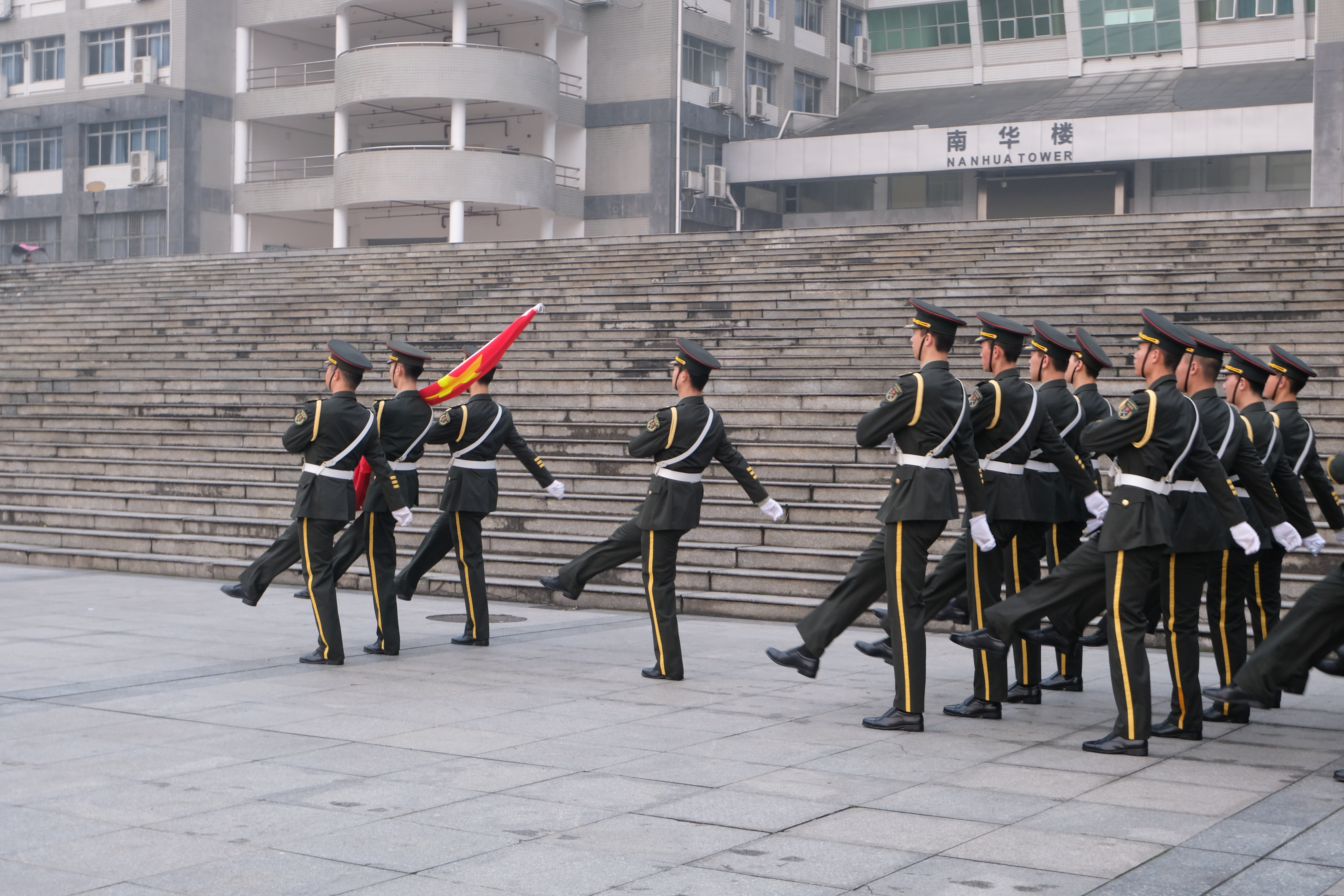 迈着铿锵有力的步伐,校国旗护卫队的队员们护送着国旗向国旗台走去。伴随着雄壮的《义勇军进行曲》,五星红旗在东方红日之下冉冉升起。全体师生严肃庄重的目视着红旗,眼中充满了自豪和奋发向上的斗志。