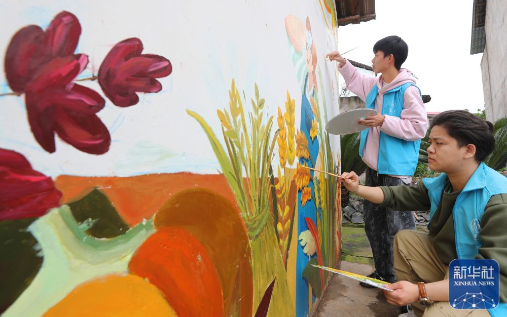 4月29日,在衡阳县西渡镇新桥村,南华大学的大学生志愿者在绘墙画。