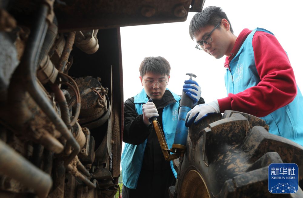 4月29日,在衡阳县西渡镇新桥村,南华大学的大学生志愿者在检修农机。