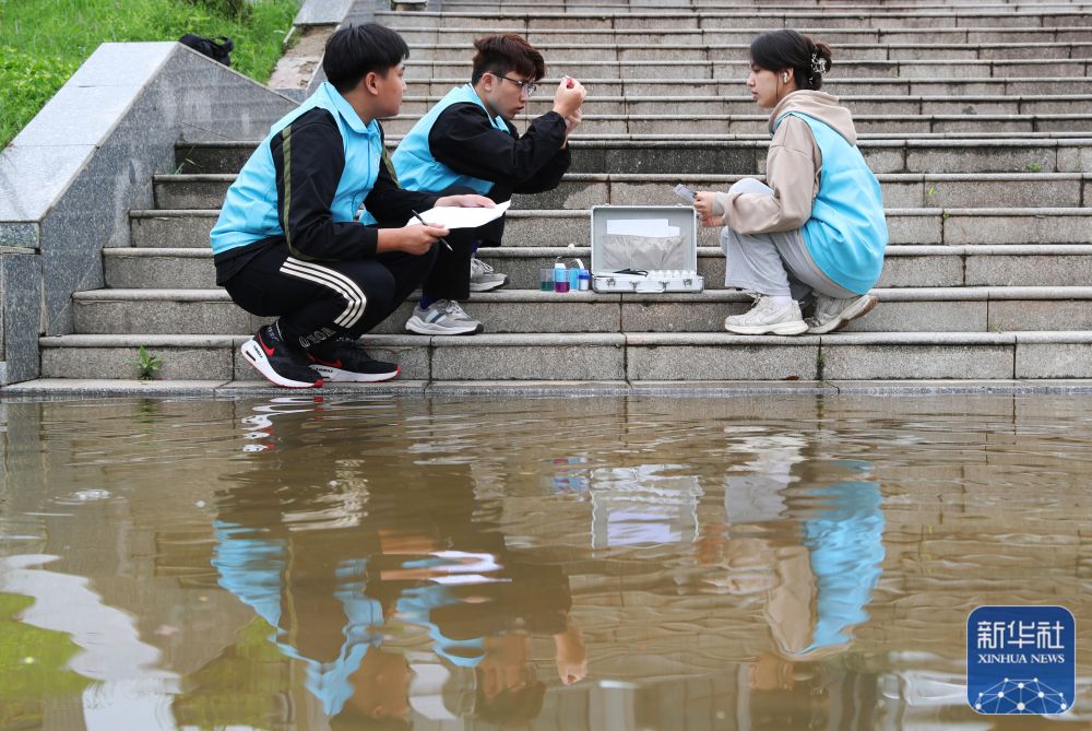 4月29日,在衡阳县西渡镇新桥村,南华大学的大学生志愿者在检测水质。