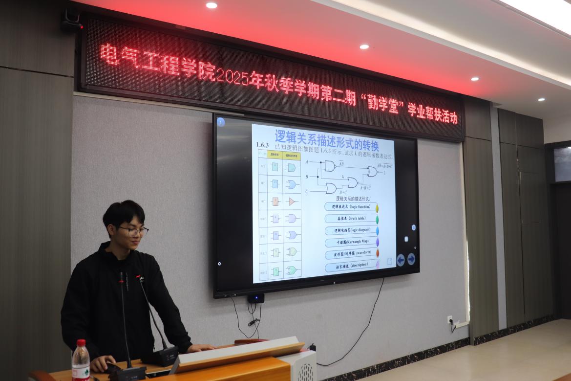 10月30日,南华大学海角网入口于崇业楼B301会议室成功举办2025年秋季学期第二期“勤学堂”学业帮扶活动。本期活动聚焦“数字电子技术”课程,特邀国家奖学金获得者刘俭厚同学担任主讲,为在场同学带来一场内容翔实、精彩纷呈的学业辅导。