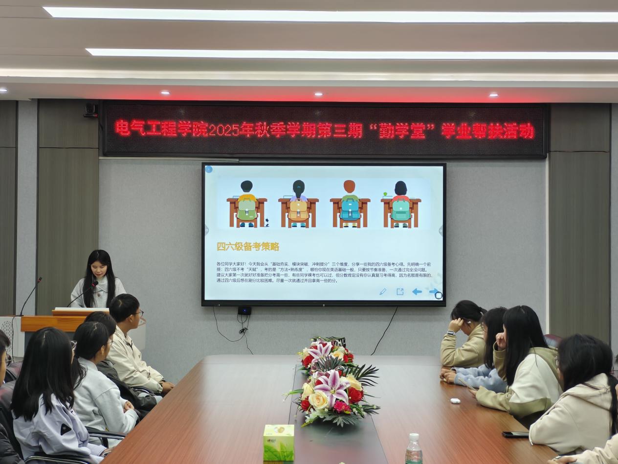 11月4日,南华大学海角网入口于电气楼B301会议室成功举办2025年秋季学期第三期“勤学堂”学业帮扶活动。本期活动的主题为“英语四六级备考经验分享”,特邀国家奖学金获得者唐鑫担任主讲,为在场的同学们带来一场内容详实、针对性强的备考指导。