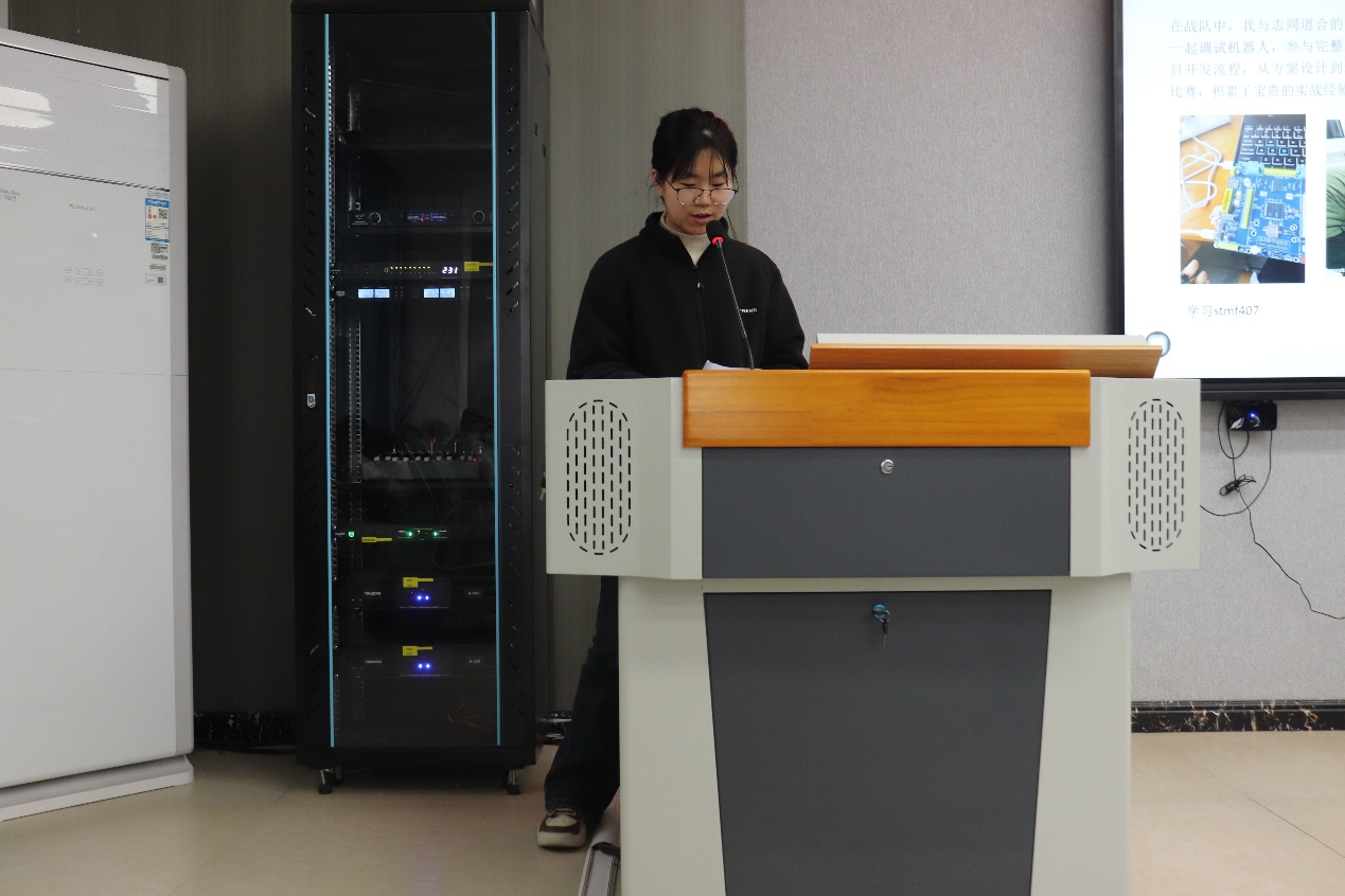 会上,三位同学依次分享了各自在竞赛中的经验与心得。郭鑫结合机器人大赛的备赛经历,强调了团队协作与有效沟通的重要性,并介绍了常见问题的应对方法。李慧捷结合C语言、单片机等竞赛核心课程内容,分享了跨学科协作的经验,并介绍了如何有效利用AI工具与开源社区资源辅助备赛。李子梦系统梳理了电子设计竞赛的备赛全流程,涵盖团队分工、导师对接等关键环节,并强调在实践中锤炼综合能力是赢得比赛的核心所在。在互动环节,同学们积极提问,就STM32单片机学习等具体问题与主讲人深入交流,所有疑问均得到细致解答。