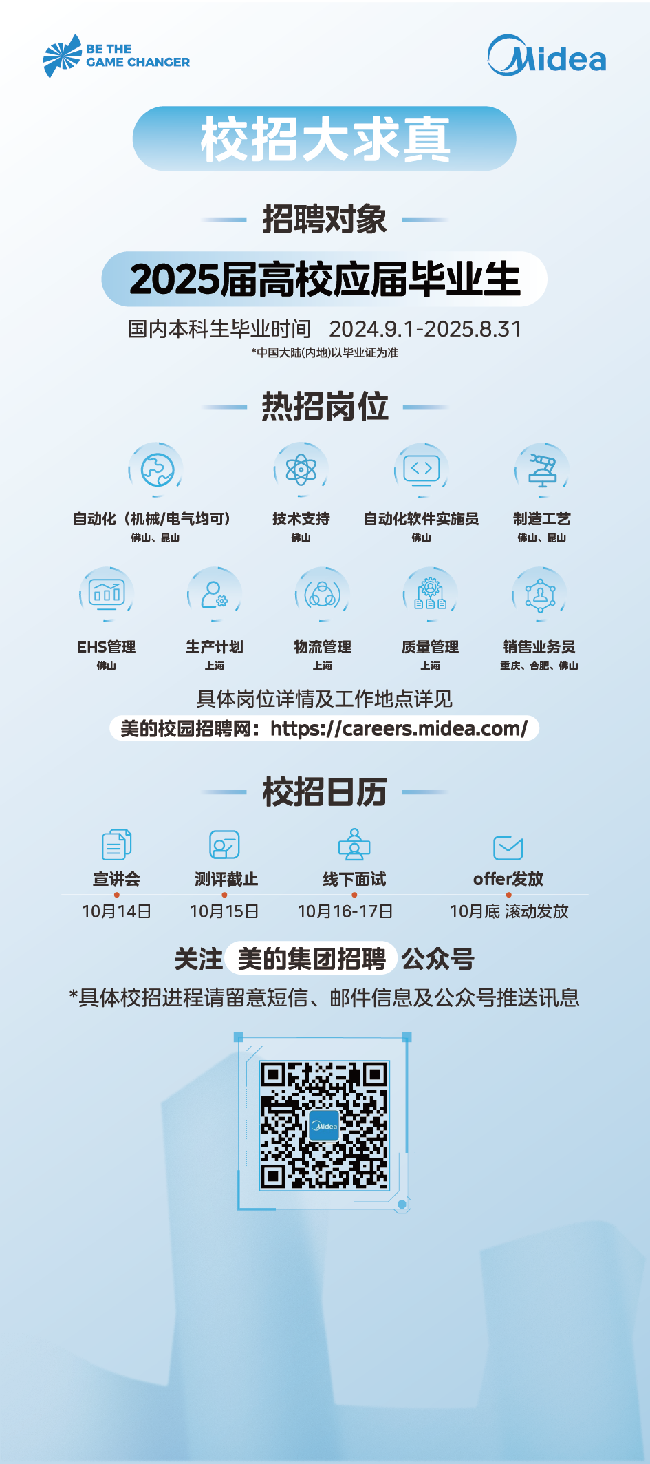 #美的集团校招-南华大学宣讲会📣📣⏱10月14日(周一)15:00-16:30📍雨母校区-松霖大学生活动中心就业多功能厅😎校友倾情分享,现场福利送不停!👇🏻查看热招岗位,等你来投递!🔍扫码进微信群,离offer更近一步❗️报名网址:https://jiuye.usc.edu.cn/teachin/view/id/112113