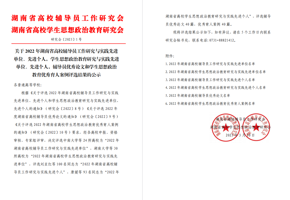近日,在湖南省高校学生思想政治教育研究会、湖南省高校辅导员工作研究会组织开展的2022年先进单位和先进个人评选中,我院辅导员周珍珍老师被授予“2022年湖南省高校辅导员工作研究与实践先进个人”荣誉称号。
