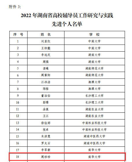 我院辅导员周珍珍老师授予“2022年湖南省高校辅导员工作研究与实践先进个人”荣誉称号