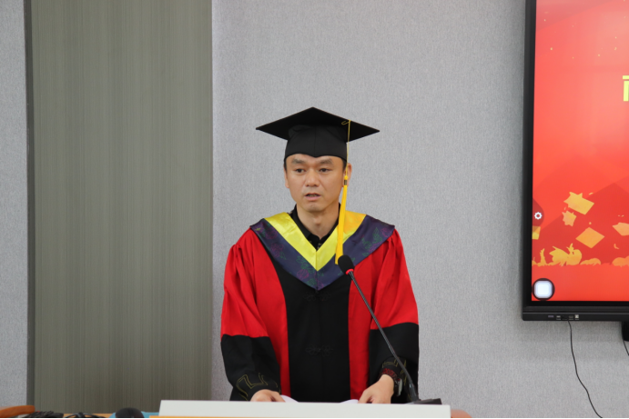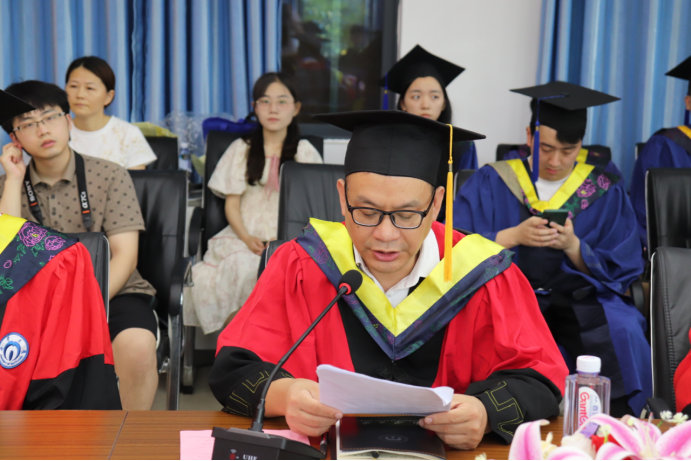 学院党委书记盛义发宣读南华大学学位评定委员会文件。他代表海角网入口全体教职工向圆满完成研究生阶段学业、顺利获得学位的同学们表示热烈的祝贺。