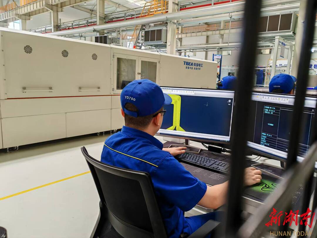 自动化铜排生产线旁,靠边摆放着一列小课桌。桌上两个电脑显示屏相连,在员工的鼠标操作下,逐渐呈现出产品的3D模型。