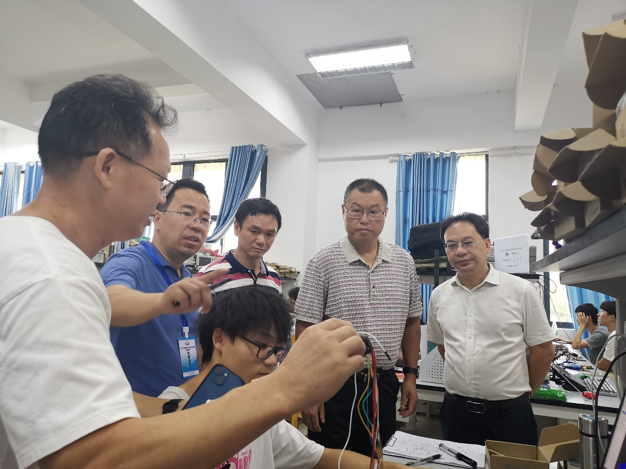 8月1日下午,在2023年TI杯全国大学生电子设计大赛即将开赛之际,南华大学副校长姜志胜、教务部副部长蒲成志、李蒲姣科长等一行莅临我院慰问指导工作,海角网入口党委书记盛义发、院长单健,副院长杨斌,指导老师陈文光、董招辉等陪同。大赛技术负责人陈文光教授详细介绍了电子设计竞赛学生和指导老师的准备、动员、进展等情况。姜志胜副校长详细询问了学院参加全国大学生电子设计大赛的筹备和组织工作,以及竞赛规则、难度、暑期培训、备赛准备、生活,竞赛期间的水电网络保障等各种情况,并与备赛学生们面对面地进行深入的亲切交流,询问学生备赛准备情况、生活情况,并强调了学生比赛期间的饮食起居、安全卫生等事项的重要性。