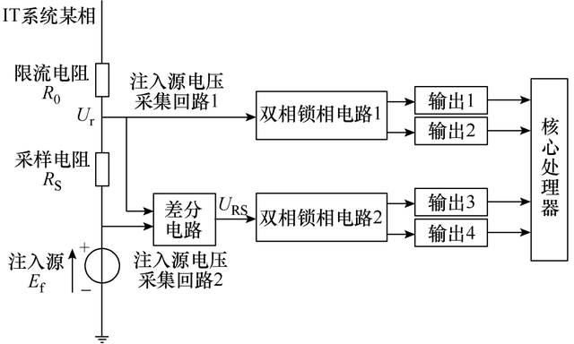 双相锁相放大器不仅能够锁定掺杂在工频信号和众多其他噪声中的双频信号,而且其同时使用两组低通滤波器和乘法器,所以最终能消除输出依赖参考信号和被测信号相位差的问题。由于没有在IT系统母线处安装电压互感器,所以不能直接测得Uf,需要通过图3所示的绝缘监测采集电路采集得到。