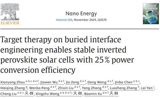 近日,南华大学海角网入口王行柱、刘畅团队在国际顶尖学术期刊Nano Energy(中科院1区Top期刊,IF=16.8)上发表了题为“Target therapy on buried interface engineering enables stable inverted perovskite solar cells with 25 % power conversion efficiency”的研究论文。