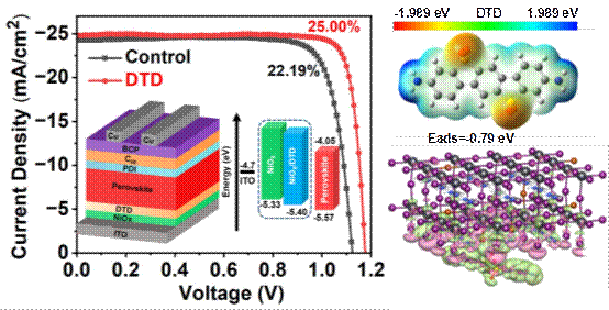 埋底界面对于实现高效稳定的钙钛矿太阳能电池至关重要。然而,由于其非暴露特性,研究和优化埋底界面仍然是一个具有挑战性的难题。该研究工作中作者提出了一种简单有效的分子靶向策略,即通过多功能分子(DTD)来调节NiOx/钙钛矿之间埋底界面,从而有效钝化钙钛矿中的埋底缺陷以及调节钙钛矿晶体的生长。DTD具有多功能靶向基团,使其能够同时与钙钛矿和NiOx发生强烈相互作用,从而在NiOx/钙钛矿埋底界面上建立分子桥,实现高质量的上层钙钛矿薄膜、优异的界面接触和钙钛矿与NiOx之间更匹配的能级。最终,DTD的修饰显著提高了钙钛矿器件的光电转换效率,从22.19 %提高到了25.00 %(认证值为24.12 %),修饰的器件同时具有优异的长期和操作稳定性。该策略为钙钛矿太阳能电池中的埋底界面提供了一种简单有效的靶向修复,实现了器件的高效率和高稳定性。