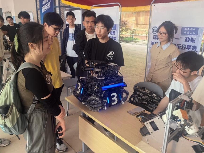 本次分享会采用"三位一体"的呈现方式,包括成果展览区、政策宣讲环节,以及经验分享会。活动现场,精彩纷呈,亮点频现。在项目展示区,10余项学生创新创业成果集中亮相,涵盖智能控制、人工智能、机器人等前沿领域。政策宣讲环节,师生们深入学习了"七个一"政策体系;经验分享阶段,通过"PPT讲解+实物演示"的方式,全方位展示了项目的最新进展。学生代表孙小婷以"理论+实践"的双重视角,生动讲述了他们的创新创业历程,"在'七个一'政策支持下,我们团队不仅成功入驻校级孵化基地,更在导师的专业指导下实现了项目快速落地,大大缩短了创业摸索期。"