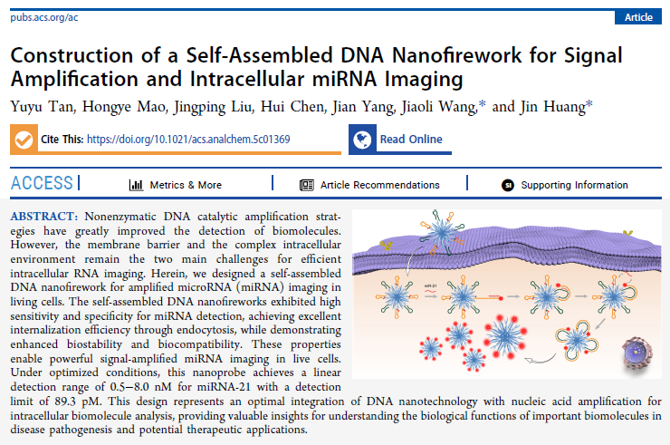 文献信息:Yuyu Tan, Hongye Mao, Jingping Liu, Hui Chen, Jian Yang, Jiaoli Wang*, and Jin Huang*, Construction of a Self-Assembled DNA Nanofirework for Signal Amplification and Intracellular miRNA Imaging, Anal. Chem., 2025, 2025, 97, 17, 9527-9534.