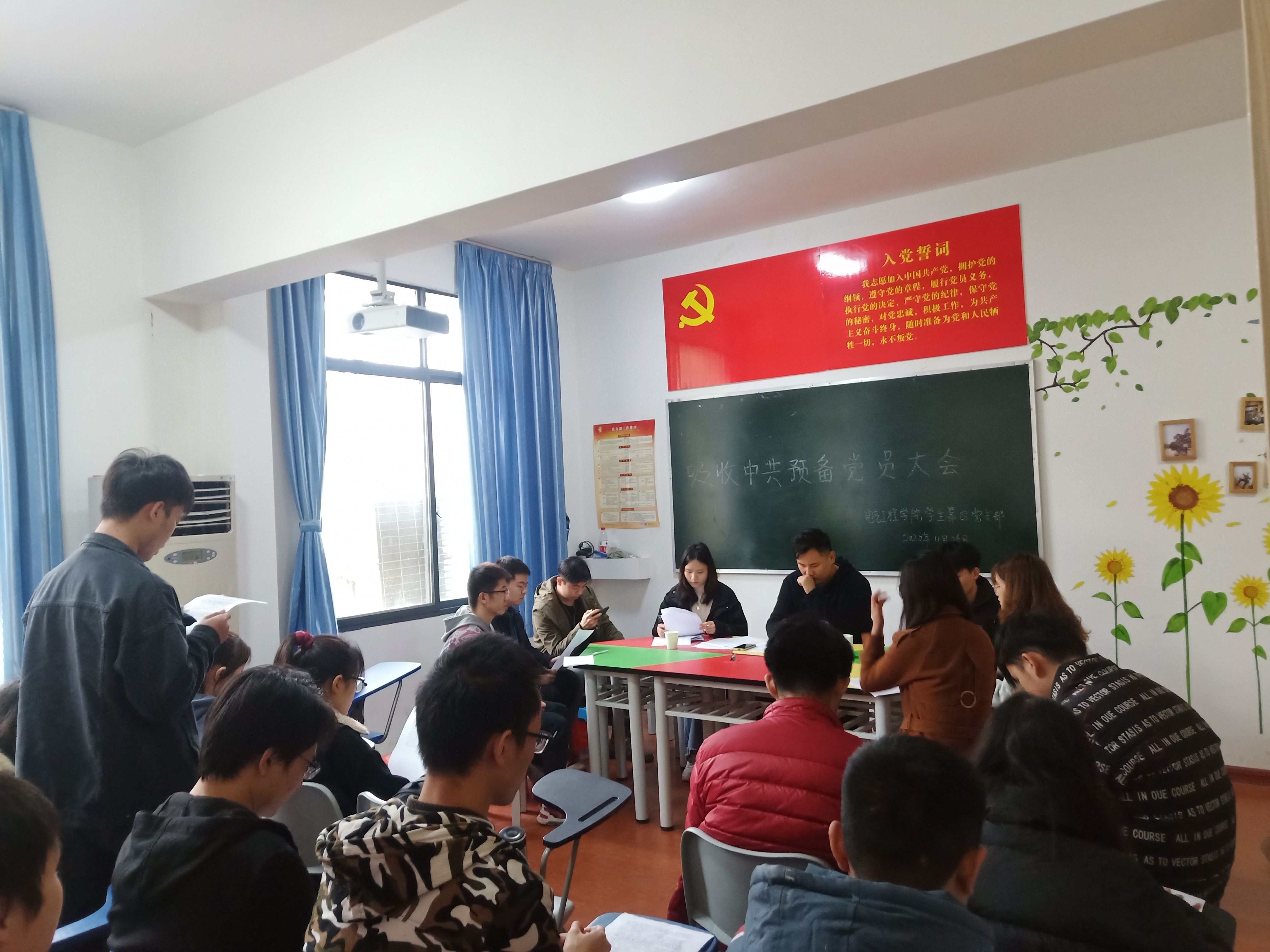 2020年11月26日中午,海角网入口学生第四党支部在电气楼成长辅导室召开了支部大会。参与会议的有支部所有党员、要吸收的发展对象,应到正式党员6名、预备党员15名,实到正式党员6名、预备党员15名。本次会议主要内容为吸收预备党员。此次会议由党支部副书记龙杨帆同志主持。
